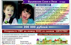 Дорогие друзья! Мы с радостью сообщаем вам, что сбор денежных средств на лечение сестричек Сони и Лизы Бушевских закрыт! Совсем скоро девочки пройдут очередной курс реабилитации и сделают очередной шаг на пути к выздоровлению. Мы говорим спасибо всем неравнодушным людям, кто принял участие в этом добром деле.
