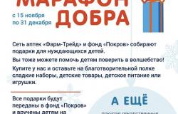 В преддверии самого доброго праздника, Нового Года, сеть аптек «Фарм-Трейд» совместно с благотворительным фондом поддержки семьи, материнства и детства «Покров» проводит благотворительную акцию «Новогодний марафон добра».