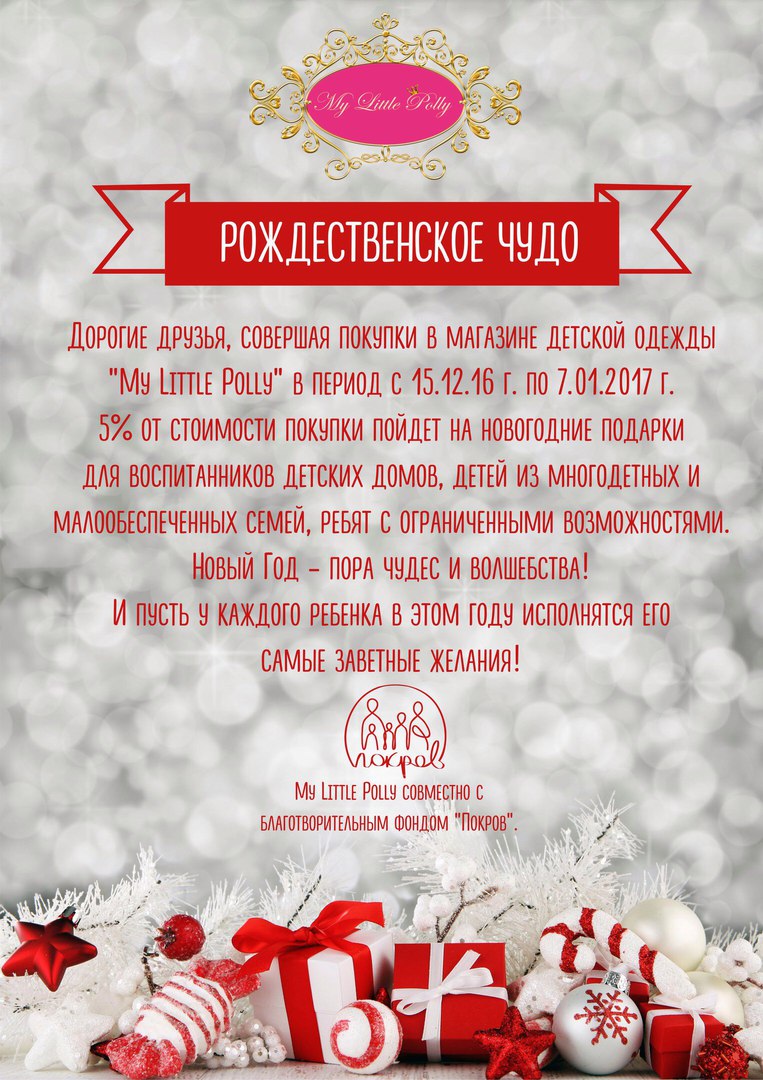 БФ "Покров" совместно с магазином My little Polly (ТЦ "Арбат", 2 этаж) запустил Рождественскую благотворительную акцию в поддержку детей.