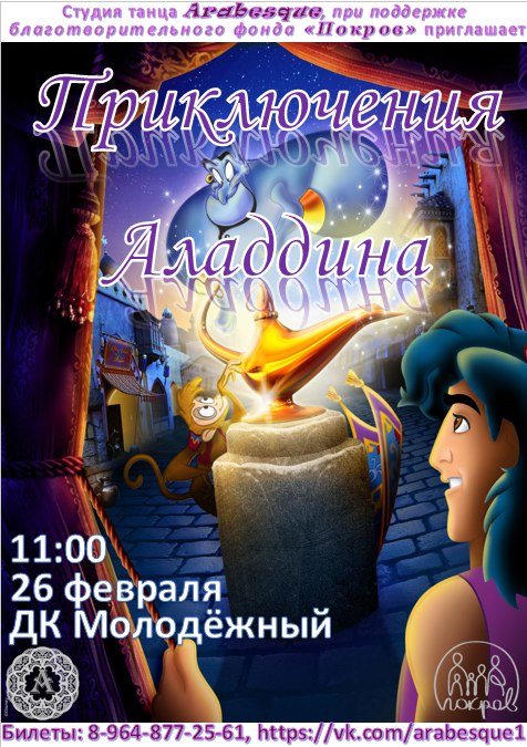 Мы приглашаем Вас на благотворительное представление "Приключения Аладдина" студии танца Arabesque!! Концерт состоится 26 февраля в 11:00 в КЗ "Молодежный". Все вырученные средства будут направлены на лечение детей, которые находятся на очереди в благотворительном фонде "Покров". Телефон для приобретения билетов: 8-964-877-25-61. #фондПокров #мирменяютлюди #счастьевдетях