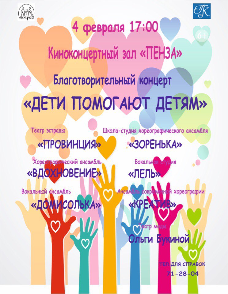 Друзья! 4 февраля в 17.00 в ККЗ "Пенза" состоится добрый концерт "Дети помогают детям"! Приглашаем Вас поддержать детей в их стремлении делать добрые дела. И, конечно же, тех ребят, которым требуется дорогостоящее лечение. Все вырученные средства будут направлены на оплату счетов на лечение Димы, Степы и Лизоньки.