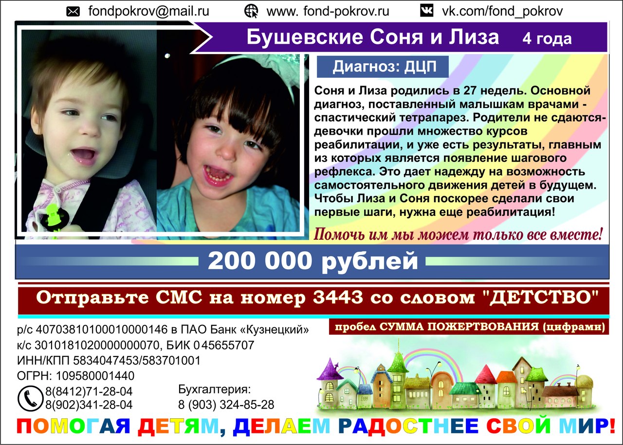 Дорогие друзья! Мы с радостью сообщаем вам, что сбор денежных средств на лечение сестричек Сони и Лизы Бушевских закрыт! Совсем скоро девочки пройдут очередной курс реабилитации и сделают очередной шаг на пути к выздоровлению. Мы говорим спасибо всем неравнодушным людям, кто принял участие в этом добром деле. Особенную благодарность хотим выразить: